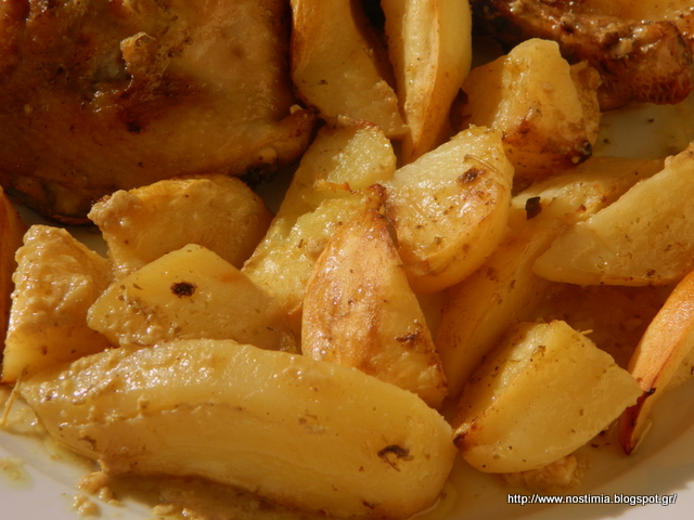 Rinse chicken. With a knife cut it and "hide" some garlic. Place it in a roasting pan with the potatoes (cut in big pieces). Mix olive oil with mustard, lemon juice, salt, pepper and garlic until you get a nice thick sauce. Brush the chicken with half of this sauce and pour the rest over the potatoes. Place kefalotiri among the potatoes. Add 1glass of water and cook i preheated oven at 180 for about 1,5 hour. While cooking, you may have to add hot water. Don't forget to check it out. Enjoy!